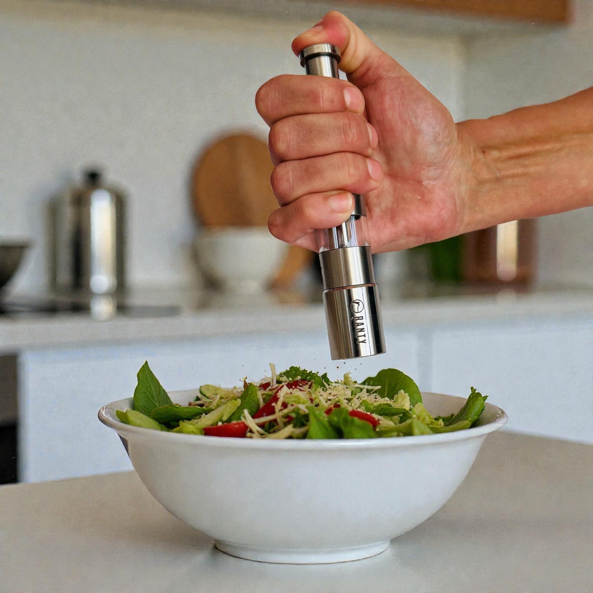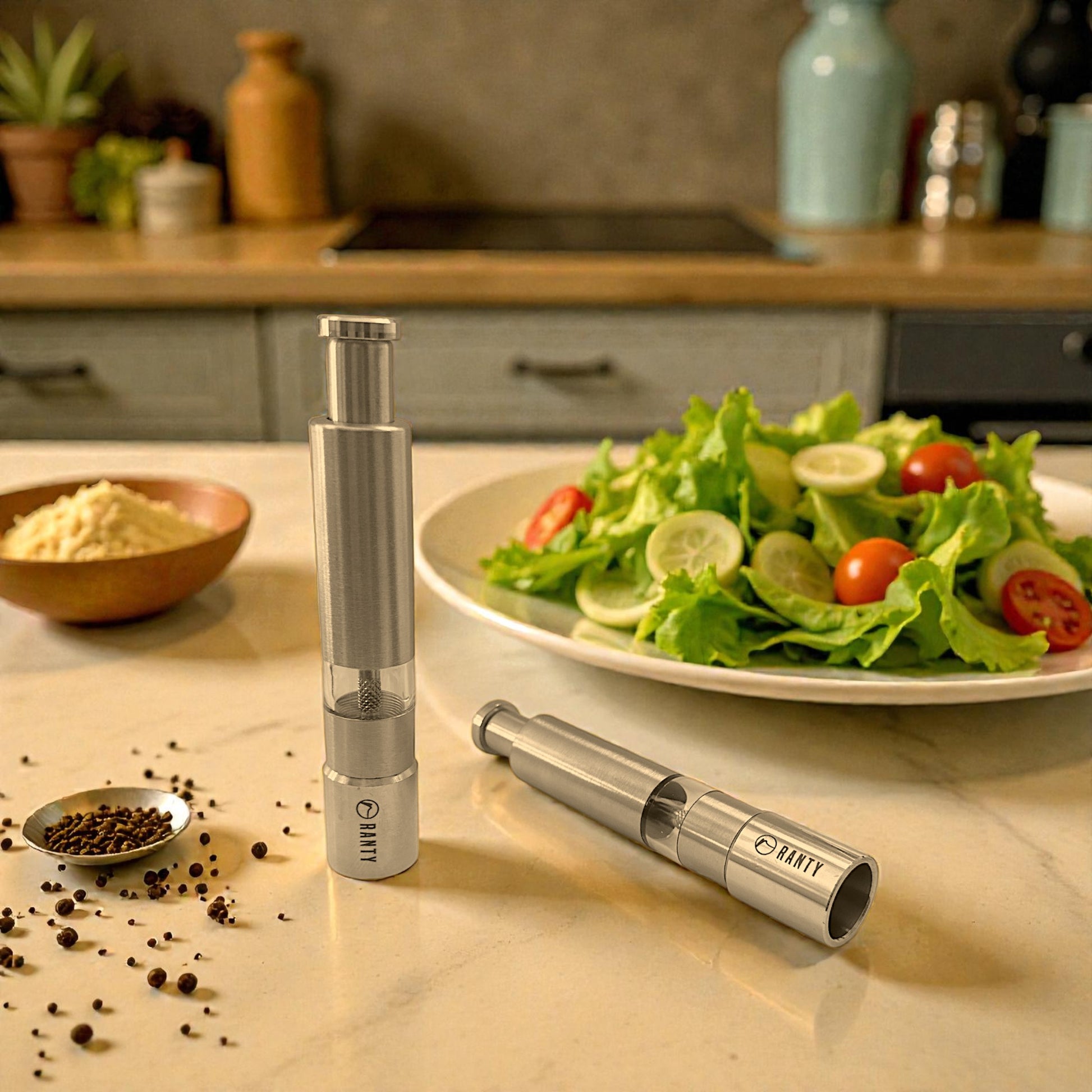 El pimentero o salero de mesa RANTY combina diseño elegante, carácter rústico y funcionalidad precisa. Diseñado para moler sal gruesa o pimienta en grano al momento, realza cada plato con frescura y control, transformando un gesto cotidiano en una experiencia gastronómica.